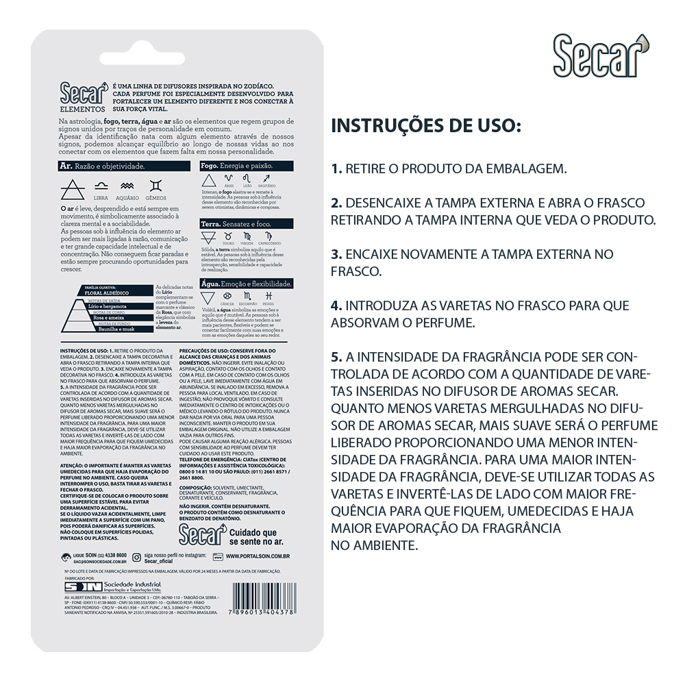 Secar Elementos é uma linha de difusores inspirada no zodíaco.Cada perfume foi especialmente desenvolvido para fortalecer um elemento diferente e nos conectar à sua força vital. Na astrologia, fogo, terra, água e ar são os elementos que regem grupos de signos unidos por traços de personalidade em comum.
