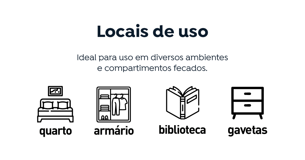 INSTRUÇÕES DE USO:1. Limpe bem o local onde houver mofo antes de colocar o Secar.2. Remova a tampa do Secar e retire o lacre de alumínio, tomando cuidado para não remover ou danificar o filtro branco que se encontra abaixo dele. Tampe e coloque no local.3. No caso de armário com vários módulos, colocar um Secar em cada módulo.4. O Secar inicia sua ação de imediato e age por um período entre 1 a 3 meses variando de acordo com a quantidade de umidade encontrada no ambiente.5. Quando o nível de água atingir o limite máximo do indicador na lateral do rótulo, está na hora de substituir o Secar.