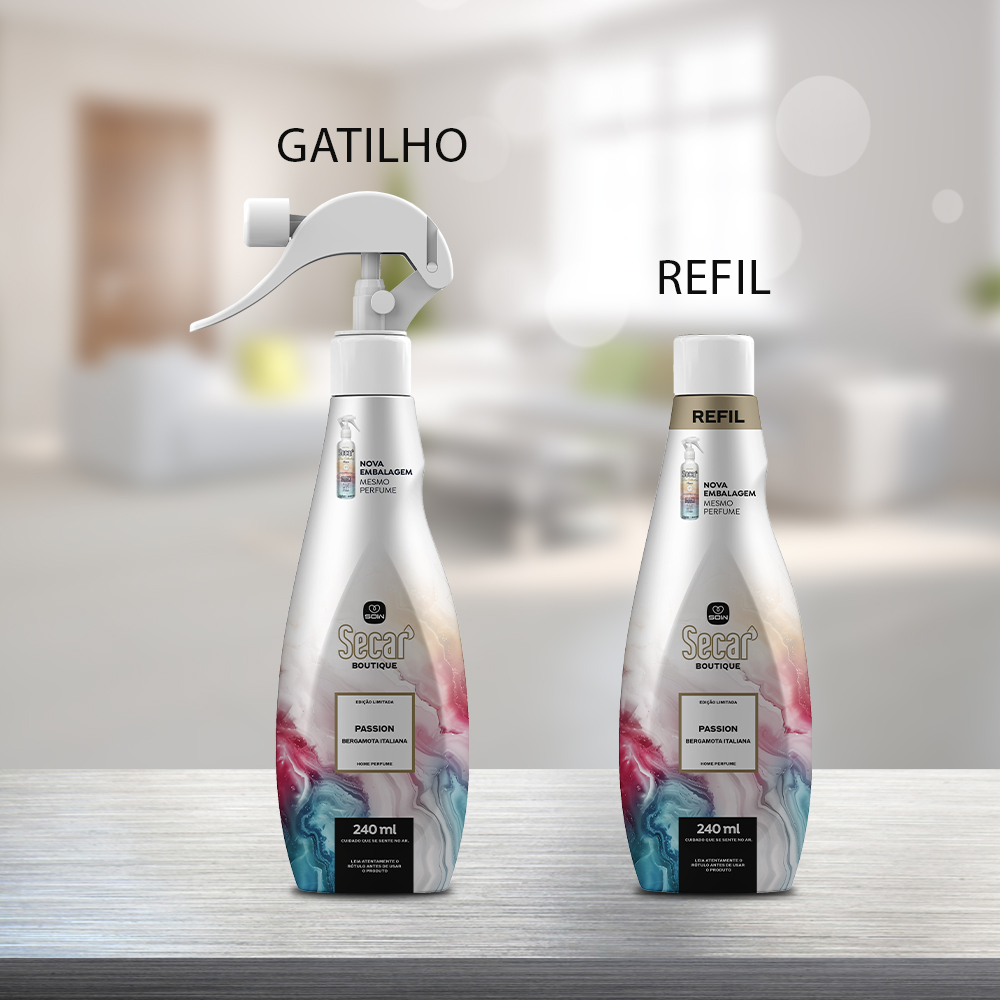 Com embalagem gatilho elegante e prática, o Secar Boutique Home Perfume garante perfumação intensa em ambientes e tecidos. Passion Bergamota Italiana é uma fragrância premium, com notas de cardamomo, alecrim, âmbar e rosas, que traduz sofisticação e bem-estar.
